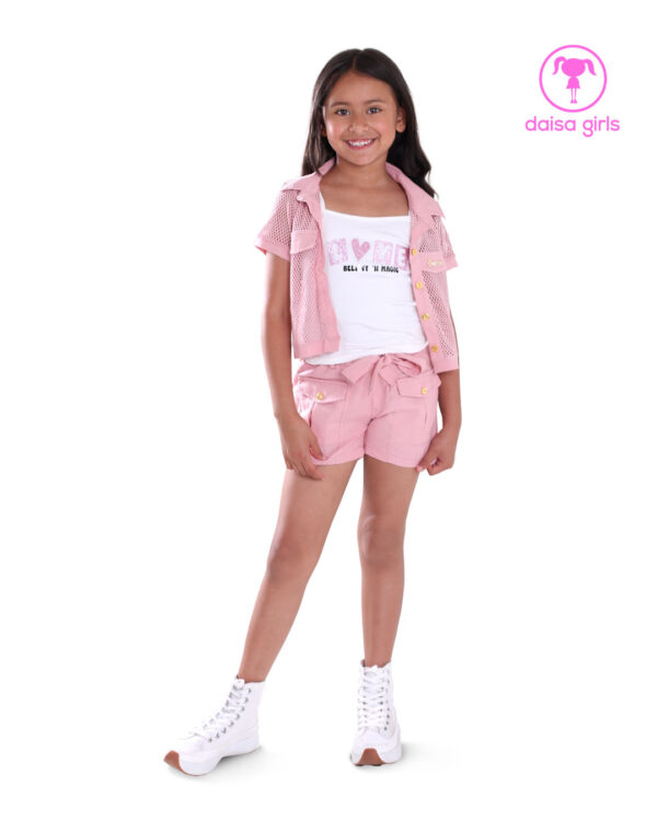 Conjunto de short en lino rígido, pretina encauchada, lazo en pretina, bolsillos con tapa + Camisa en lino rígido y malla, largo crop, cuello camisero, manga corta con puño, botonadura, tapas y pretina en cintura + esqueleto.
