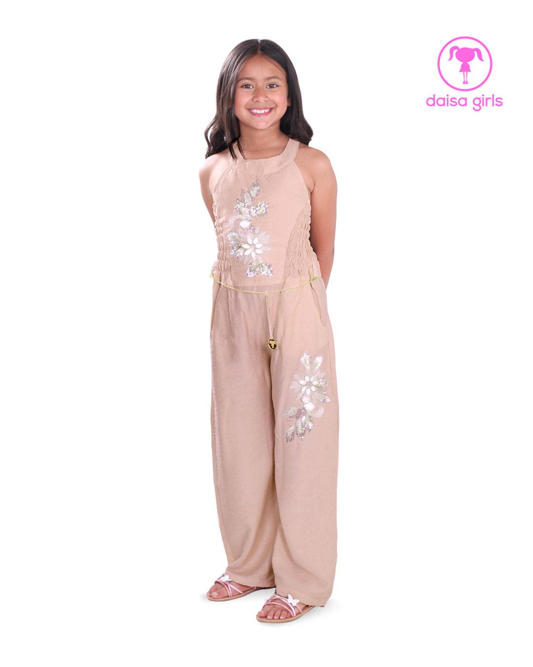 Enterizo en raýón estampado, silueta palazzo, escote redondo, manga sisa, abertura en espalda, pretina con caucho, cintura entallada, bolsillos en pantalon delantero. Incluye cadena dije.