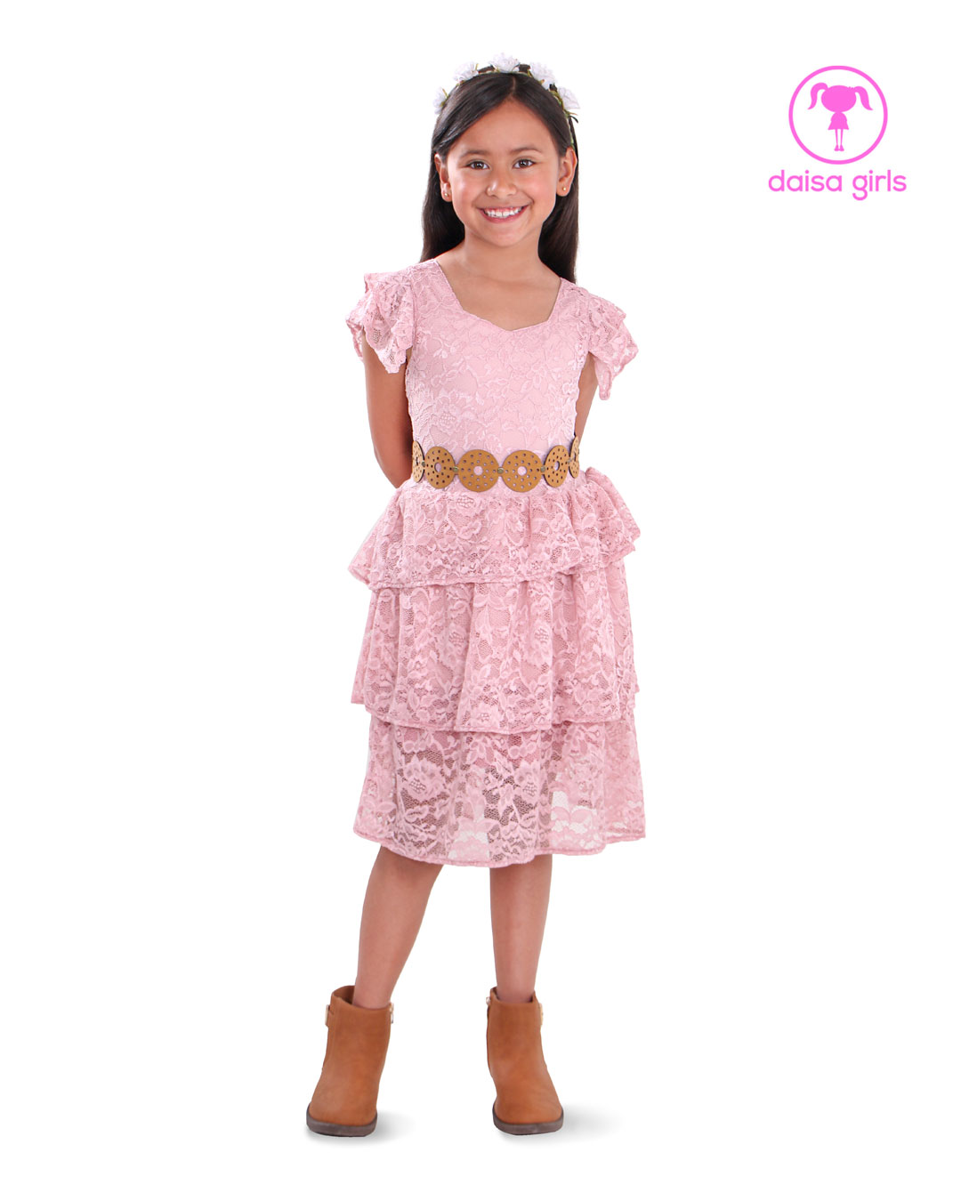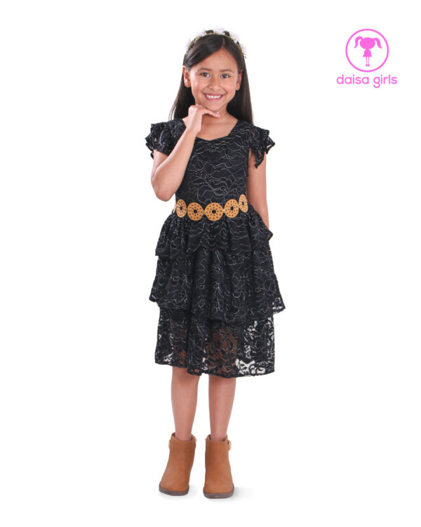 Vestido en blonda, maxi (largo), manga sisa, escote corazón, sisa con tira y boleros rotondos, escote y entalle en espalda, falda en boleros asimétricos con recogido.